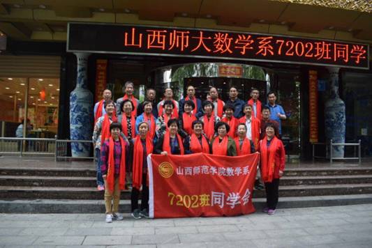 2015年他们在宁武举行毕业后第一次奔七大聚会,创编了队歌,制定了一年一大聚、各地轮流组织的聚会形式,同时在太原举行和班主任王民汉共叙师生情的聚会;2016年他们在运城和数学系原书记赵北烁老师进行历时五天的相聚,成立山西师大数学系7202班同学会,建立队旗;2017年他们在长治相聚;2018年他们相聚母校,在晚会上老班长陈花果发言致辞,她表示毕业43周年了,他们已经聚会5次,每年轮流到一个地方聚会,都要把当地的代课老师请来,和同学们一起畅谈老员工活。大家入校前大都是农民,师大为他们提供了成长的平台,奠定了良好的基础,才有机会参加工作,退休了领着国家工资,享受着国家退休人员的优厚待遇,感谢师大,感谢母校,感谢老师。公司党委书记郝红霞表示,这些老员工回母校聚会,他们大多是老师,他们40多年为社会创造了价值,为基础教育培养了很多优秀学子,为高等学府培养人才打下了坚实的基础,母校以他们为荣,师大新校区建设即将开工,希望老员工以后能再聚新校区。
