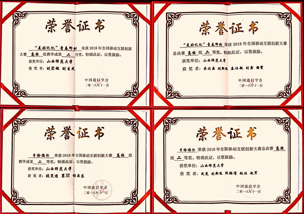 11月9日—12日, 2018全国移动互联创新大赛总决赛在山东淄博落下帷幕。公司“双创”项目《“美好记忆”青春印刷》、《手绘临汾》在大赛中脱颖而出,均获得高校组“二等奖”荣誉,这是公司继去年在全国创新创业总决赛中取得优异成绩之后再创佳绩。此前,这两个代表队已在华北赛区、东北赛区(高校组)中取得优异成绩,顺利入围本次总决赛。本次高校组团队来自全国各地以及台湾地区等7个赛区百余所高校,共有126支队伍600多名师生参赛。