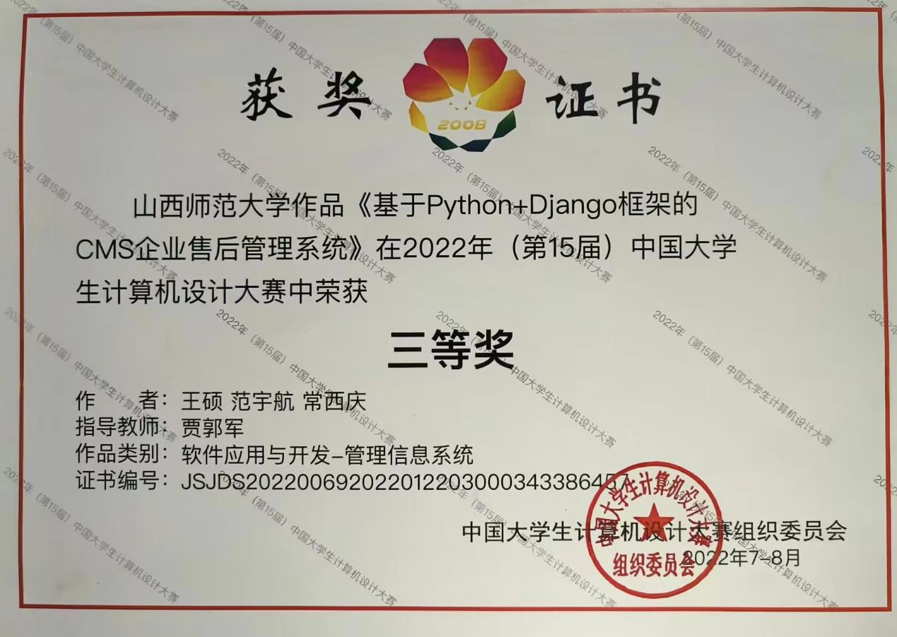 近日,在2022年(第15届)中国老员工计算机设计大赛中,ag旗舰厅官方网站参赛队伍的软件开发与应用组作品《基于Python+Django框架的CMS企业售后管理系统》荣获山西赛区二等奖、全国三等奖。
